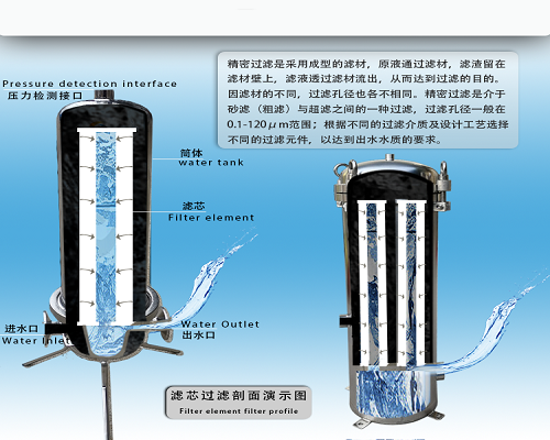 多芯精密過(guò)濾器是一種常見(jiàn)的過(guò)濾設(shè)備,可以用來(lái)過(guò)濾原水中殘存的微量懸浮顆粒、膠體、微生物等,隨著制水時(shí)間的增長(zhǎng),濾芯因截留物的污染,其運(yùn)行阻力逐漸上升,當(dāng)運(yùn)行至進(jìn)出口水壓差達(dá)0.1MPa時(shí),應(yīng)更換濾芯。多芯精密過(guò)濾器采用成型的濾材,在壓力的作用下,使原液通過(guò)濾材,濾渣留在管壁上,濾液透過(guò)濾材流出,最終達(dá)到過(guò)濾的目的。